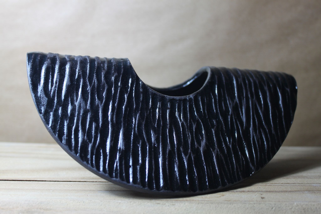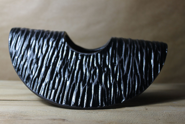 Siwa se pare d'un noir profond et d'un lustre captivant. Les lignes verticales, sculptées avec précision, créent une texture vibrante qui donne l'illusion du mouvement et capte la lumière avec intensité.